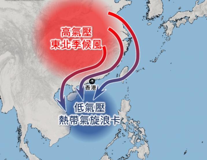 天文台解釋,原因主要有三個,首先是預料會有大風。今次香港除了受熱帶氣旋「浪卡」的影響,同時亦有東北季候風的「助攻」。香港南面有低氣壓即浪卡,周圍的空氣會自然流入低氣壓形成風,但今次香港北面同時有高氣壓即東北季候風,令氣壓差更大,因此流入低氣壓的氣流更加強,形成比沒有季候風時更大風的情況,這便是「共同效應」。「共同效應」加大了預測難度。