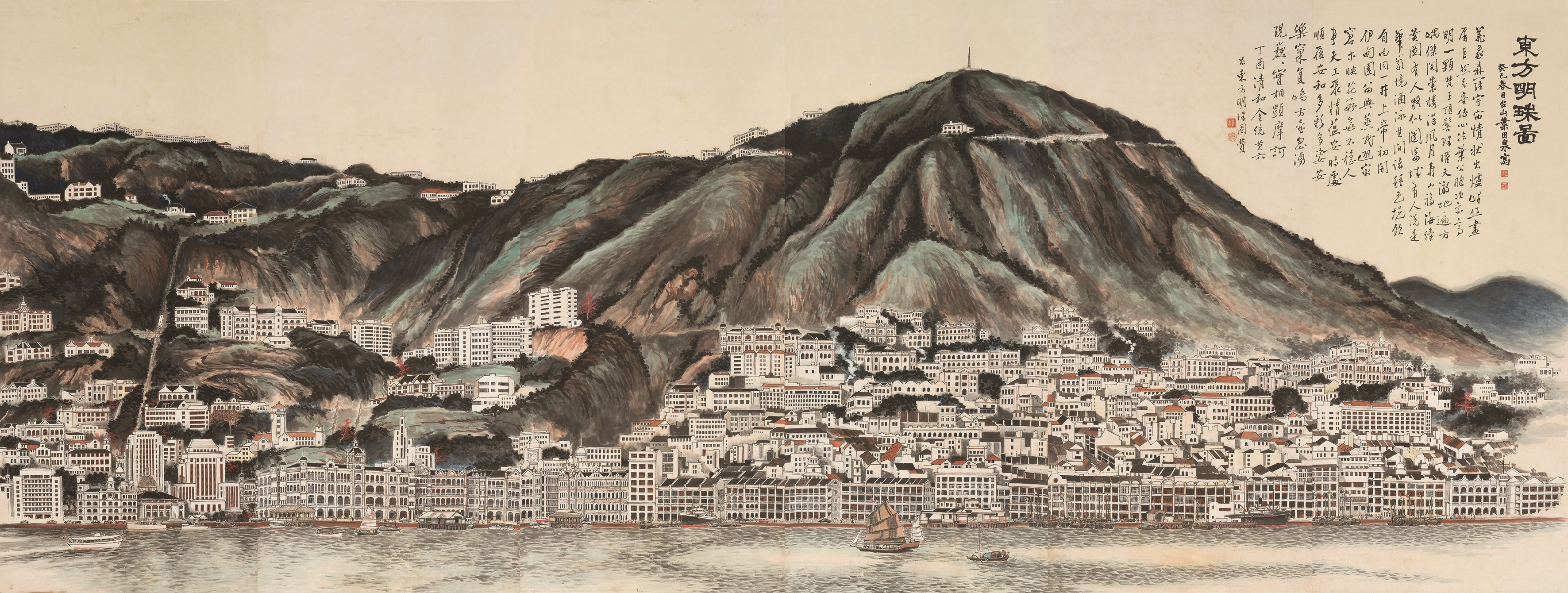 說到現今香港的熱門旅遊景點,太平山一定榜上有名,在上世紀該景點亦是香港的地標。姚進莊說,策展期間,文物館發現上世紀畫家繪畫香港時,與當時的旅遊業有莫大關係,不少畫家將之入畫。如展覽中最巨幅作品——葉因泉的《東方明珠圖》,畫家以強烈光暗對比描繪太平山的盧吉道和山頂纜車,並刻意放大中環海傍的地標建築,取景明顯受當時的旅遊論述影響。畫作構圖呈現當時香港經濟的重要命脈——「南北行」,畫中的十多個碼頭,彰顯了本地藉着天然港口的優勢,將內地貨物運往外國,同時經香港將外國商品轉運內地,證明上世紀的經濟中心並非現時的中環,而是上環及西環。