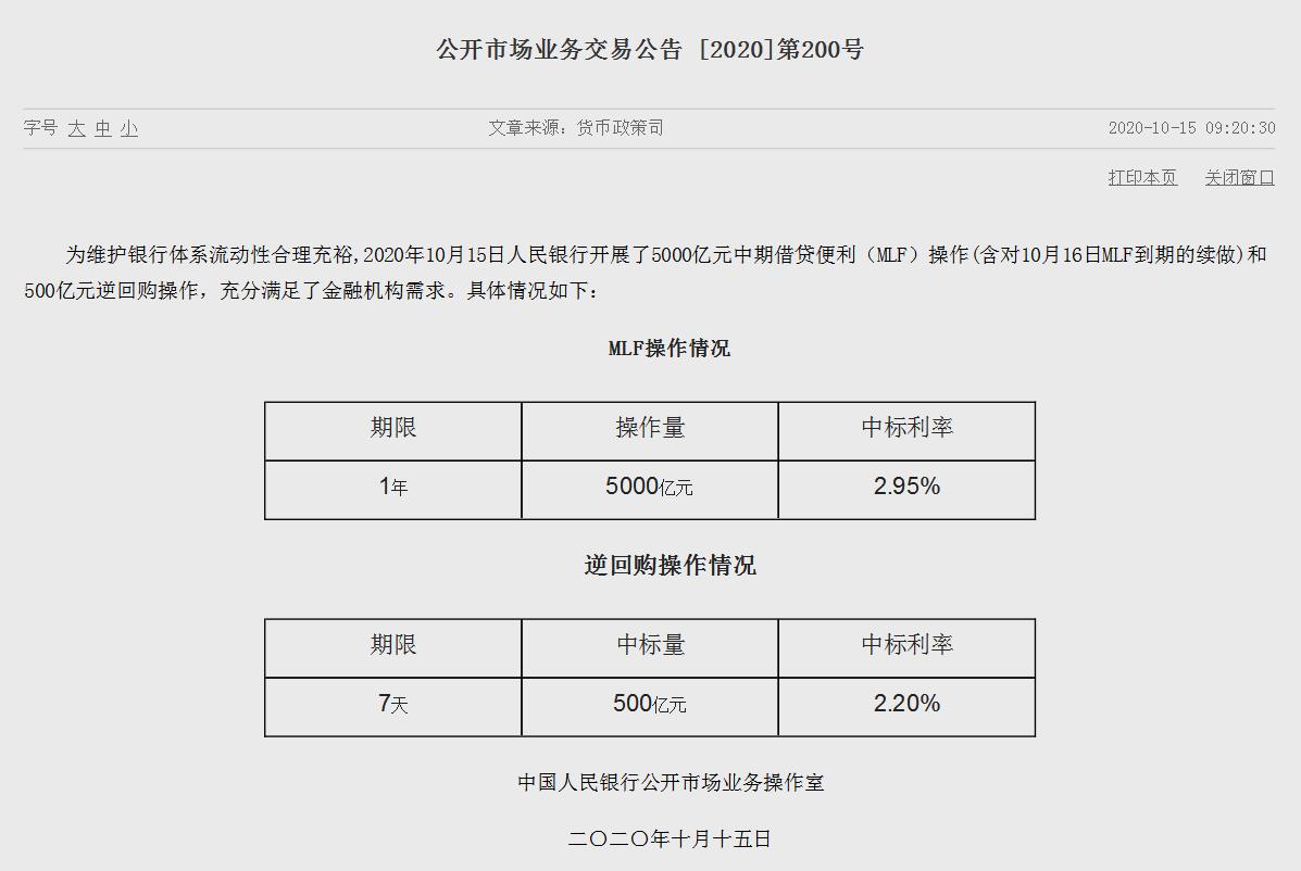 央行15日早間公告稱,為維護銀行體系流動性合理充裕,開展了5000億元中期借貸便利(MLF)操作(含對10月16日MLF到期的續做),以及500億元逆回購操作。其中,1年期MLF中標利率2.95%,7天期逆回購中標利率2.20%,均維持不變。