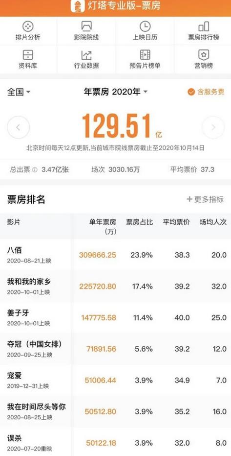 据灯塔实时数据,北京时间10月15日0时,2020年中国电影票房市场累计票房达129.5亿人民币(合19.3亿美元)。这个票房成绩也让中国正式超越北美,历史上首次成为全球第一大票仓。其中,票房前三名影片分别是《八佰》(30.97亿元),《我和我的家乡》(22.57亿元),《姜子牙》(14.78亿元);进口片票房最高的是诺兰执导的《信条》,票房4.54亿元。