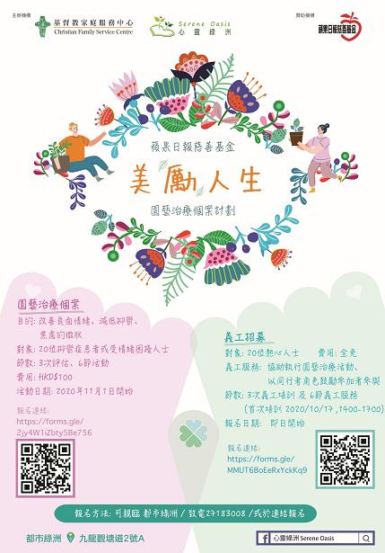 基督教家庭服務中心「心靈綠州」(全港首個園藝治療花園)於今年11月開始舉辦「美『勵』人生園藝治療個案計劃」,服務抑鬱症患者或情緒受困擾人士,以園藝治療手段配以個案輔導形式,協助他們消除不必要尷尬,將抑壓心底的說話抒發出來。