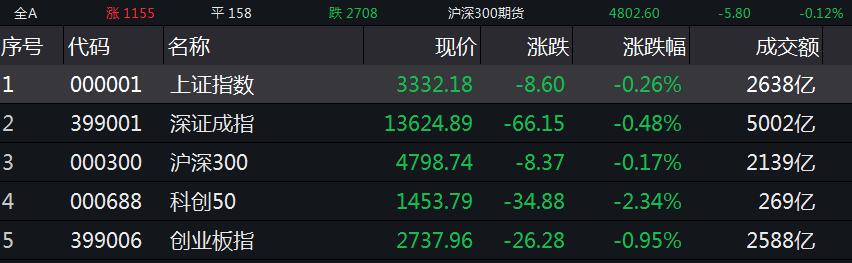 截至收盤,滬指報3332.18點,跌幅0.26%,成交額2638.49億元;深成指報13624.89點,跌幅0.48%,成交額5001.58億元;創業板指報2737.96點,跌幅0.95%;上證50指數報3371.40點,漲幅0.06%。