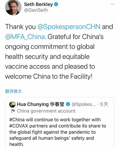 全球疫苗免疫聯盟行政總裁伯克利還特意轉發了中國外交部發言人華春瑩有關中國加入「新冠肺炎疫苗實施計劃」的推特,並表示:「謝謝你,華春瑩和中國外交部。感謝中國對全球健康安全和公平獲得疫苗的持續承諾,歡迎中國加入機構!」