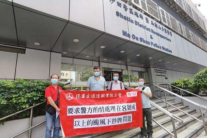 汽車交通運輸業總工會今日(16日)和工友到馬鞍山警署表達訴求,要求警方酌情處理在8號颱風警告訊號下對職業車輛的抄牌情況。