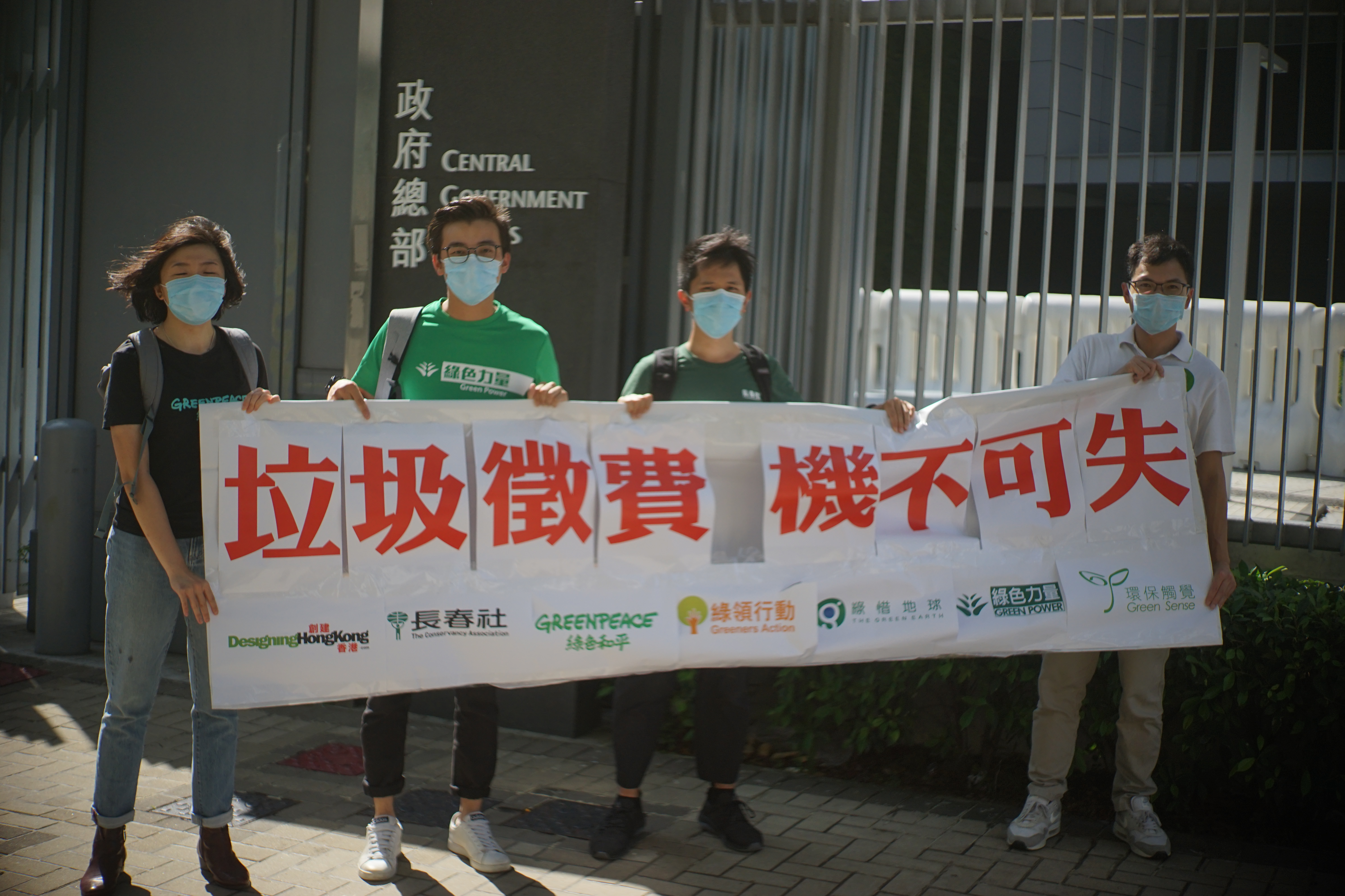 綠領行動、綠惜地球、綠色和平、長春社、創建香港和綠色力量今日(16日)到立法會拉起「垃圾徵費機不可失」橫額,並向內務委員會副主席馬逢國遞交請願信,促請議員支持重啟垃圾徵費法案委員會。