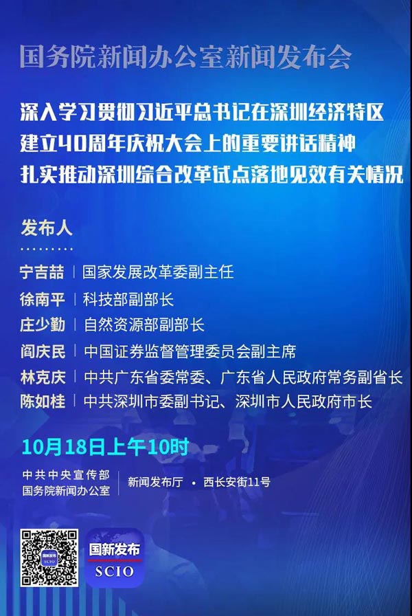 國務院新聞辦公室定於10月18日(星期日)10時舉行新聞發布會,請國家發展改革委副主任寧吉喆,科技部副部長徐南平,自然資源部副部長莊少勤,中國證券監督管理委員會副主席閻慶民,中共廣東省委常委、廣東省人民政府常務副省長林克慶,中共深圳市委副書記、深圳市人民政府市長陳如桂介紹深入學習貫徹習近平總書記在深圳經濟特區建立40周年慶祝大會上的重要講話精神,紮實推動深圳綜合改革試點落地見效有關情況並答記者問。
