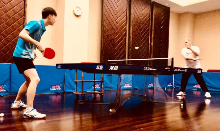 资料图片:乔希·塞利格(右)与中国乒乓球教练打球。图由受访者提供