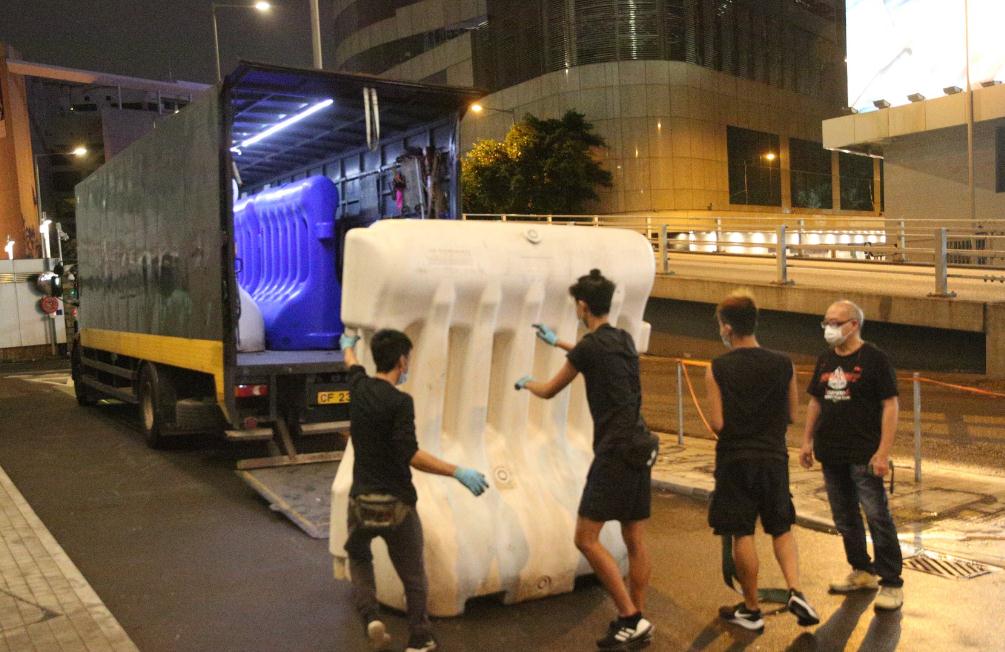 隨着示威活動降溫,暴力衝擊場面減少,昨晚(18日)7時許,多次成為示威者圍堵目標、位於灣仔軍器廠街的警察總部,率先移除約2米高的水馬陣,一些金屬閘口亦被拆走。多名工人到警總外軍器廠街,他們先將水馬內的水放走,之後用起重機將水馬逐一搬上貨車運走,現場有警員戒備。