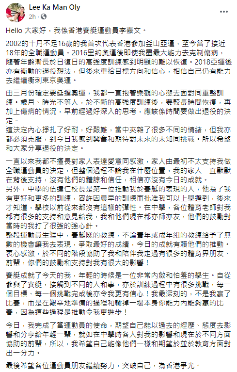 李嘉文表示,退役絕非容易的決定,但經過深思熟慮後,決定是時候交棒,冀薪火相傳延續至有潛質的年青新一代。她說自上屆奧運後,一直面對傷患及治療等問題,加上東京奧運延期,她認為已難以維持狀態,達至競賽的水平。李嘉文向多年來一直支持她的人表示感謝,日後會繼續以各種方式支持賽艇運動。