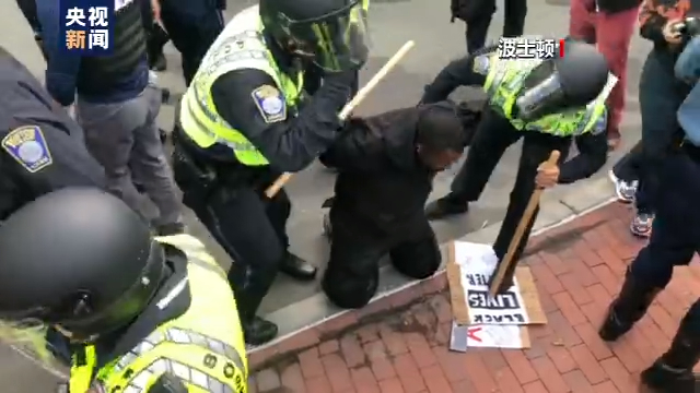 當地時間18日,在波士頓的抗議活動上,全副武裝的警察與抗議民眾發生衝突,警察用警棍等武器推搡抗議者,場面混亂。多名抗議者被警方逮捕。