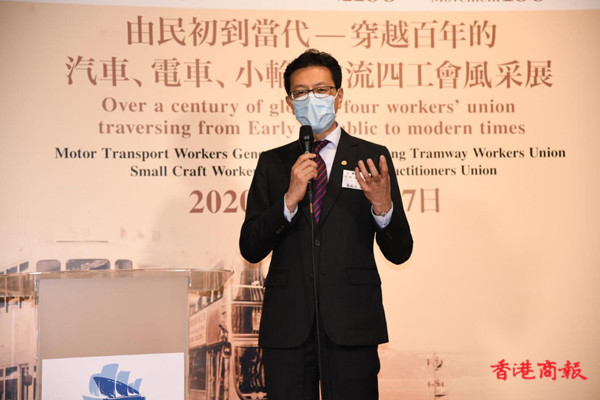 工聯會副理事長、四間工會代表陳兆華致辭時表示,四間工會經歷百年滄桑,由民初至今經歷漫長歲月,自建會以來一直紥根香港,心繫勞工,組織了一次又一次的維護工友權益行動,致力於服務會員工友,展現出關愛、刻苦、團結、堅毅和追求卓越的愛國工會風采。這一代一代工會前輩為工友鍥而不捨的無私奉獻精神,值得我們學習,並希望透過展覽,展現工會時代在變遷巨輪下所以留下的印記。