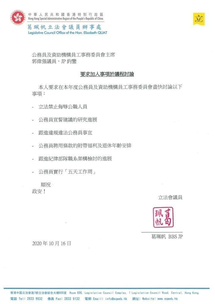 民建聯立法會議員葛珮帆在社交平台表示,已去信公務員及資助機構員工事務委員會主席郭偉強,要求加入6項相關議題作討論。