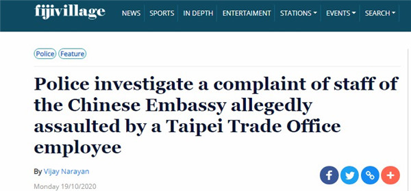 對於台媒的報道,斐濟媒體「fijivillage」19日消息卻稱,當地警方目前正在調查一起中國駐斐濟大使館工作人員對台北駐斐濟商務辦事處一名職員的控告——「後者8日襲擊中國駐斐濟大使館工作人員」。報道還提到,警方並未收到台方工作人員遭襲的報告。