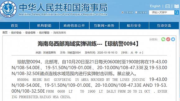 據央視新聞20日報道,洋浦海事局發布航行警告:瓊航警0094,北部灣,自10月20日至21日每天0600時至1900時將在19-43.00N/108-54.00E、19-51.50N/109-01.00E、20-10.00N/108-47.33E及19-53.00N/108-32.50E諸點連線水域範圍內進行實彈射擊訓練。禁止駛入。