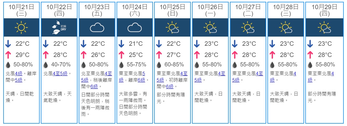 預測明日日間乾燥,氣溫介乎22至29度,吹和緩北至東北風,明日離岸風勢間中清勁。展望星期四大致天晴及乾燥,早晚稍涼。隨後一兩日雲量增多,風勢頗大。