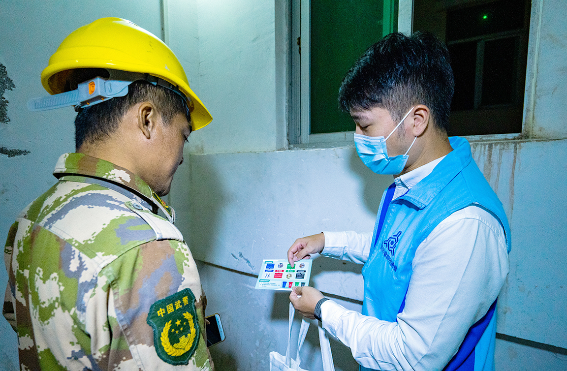 禤紹生(右)對工地施工人員進行垃圾分類宣傳。(龍少攝)