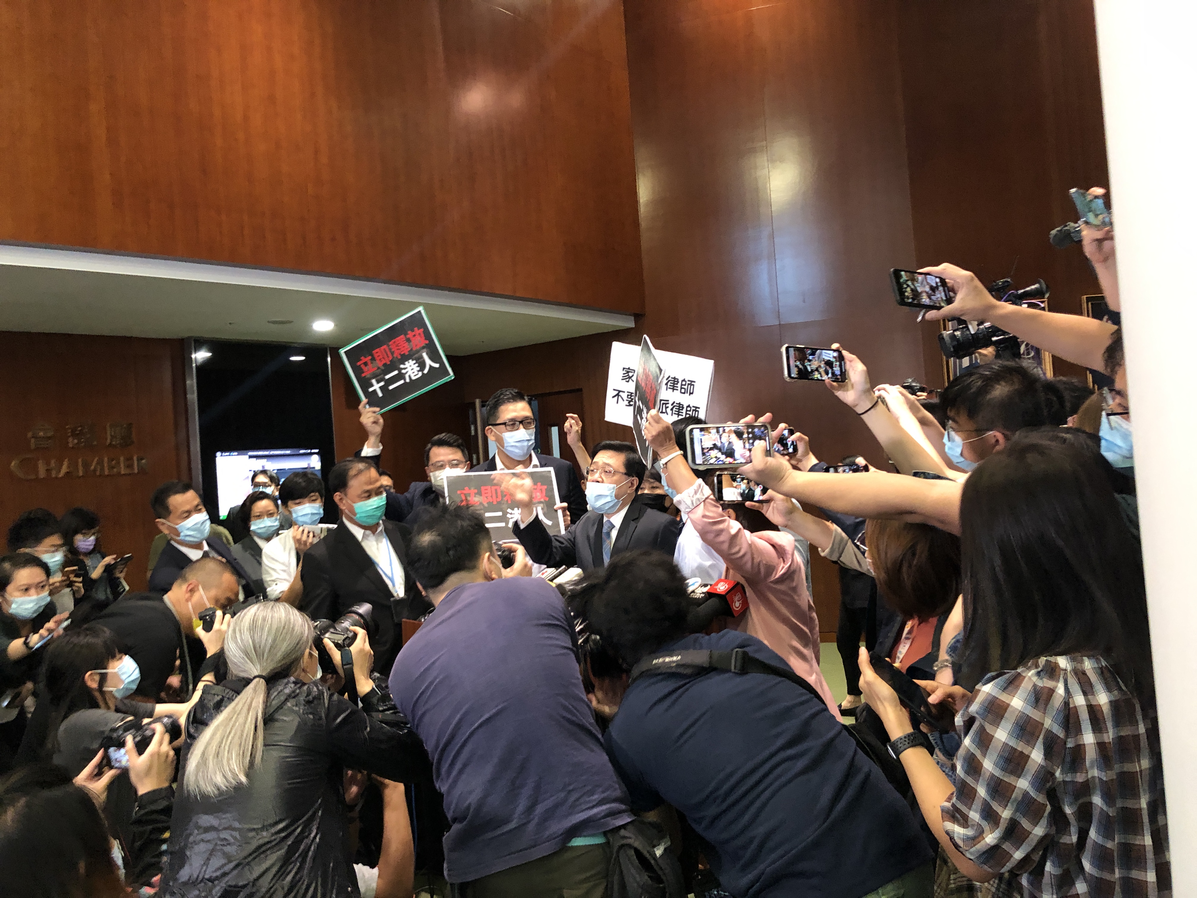 李家超完成立法會發言,準備在會議廳外見記者時,遭到反對派議員包圍,及大聲叫喊,最終未能在現場接受訪問。(記者 馮煒強)