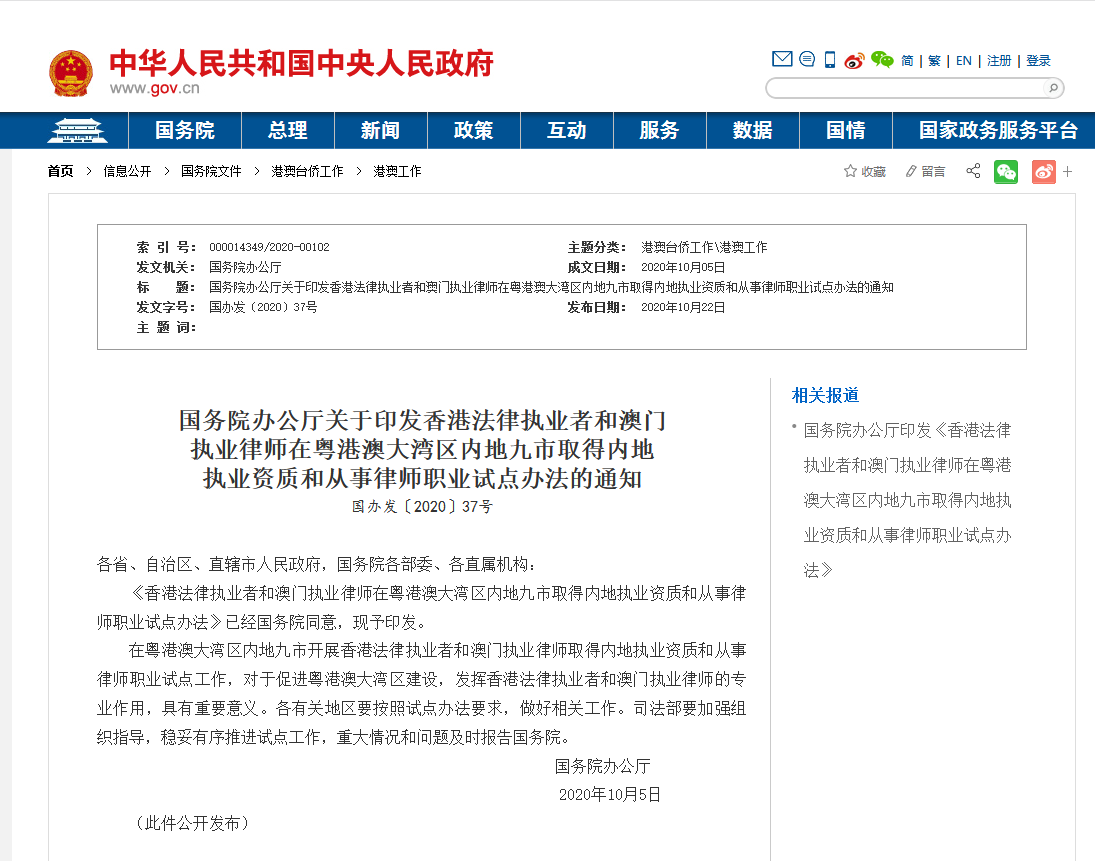 10月22日,國務院辦公廳公布印發《香港法律執業者和澳門執業律師在粵港澳大灣區內地九市取得內地執業資質和從事律師職業試點辦法》(以下簡稱《辦法》),對試點工作涉及的報名、考試、申請執業、業務範圍、執業管理和組織實施等作出規定。