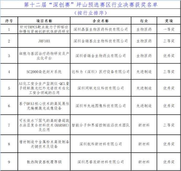據了解,此次深創賽行業決賽喜訊頻傳,深圳市坪山區9個項目經過激烈比拼,於673個參賽項目中脫穎而出獲得大獎。生物醫藥行業項目「針對TRPC5靶點致力於抑鬱症和慢性腎病創新抗體新藥研發」致力於抑鬱症、慢性腎病、抗病毒和罕見病等重大疾病的一類創新新藥(First in class)自主研發,獲得行業決賽一等獎;生物醫藥行業項目「JRF103」、先進製造行業項目「SC2000染色封片系統」、新材料行業項目「可長效水下固氣的高耐磨超疏水涂層複合材料技術(HARSHI)及應用」分別獲得各行業決賽三等獎;「細胞與基因治療藥物研發及產業化平台」、「AI化工安全生產監測儀-QCL量子級聯激光紅外光譜技術在化工安全領域的應用」、「基於DFAI核心技術的高延展性無掩模激光成像設備」、「增材製造中金屬粉末高效製備關鍵技術及設備」及「散熱陶瓷基板覆厚銅」5個項目獲得行業決賽優秀獎。