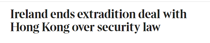 據外媒報道指,愛爾蘭在審視香港國安法後,決定停止與香港的引渡協議。这成為繼芬蘭後,最新宣布停止與香港引渡協議的歐洲國家。