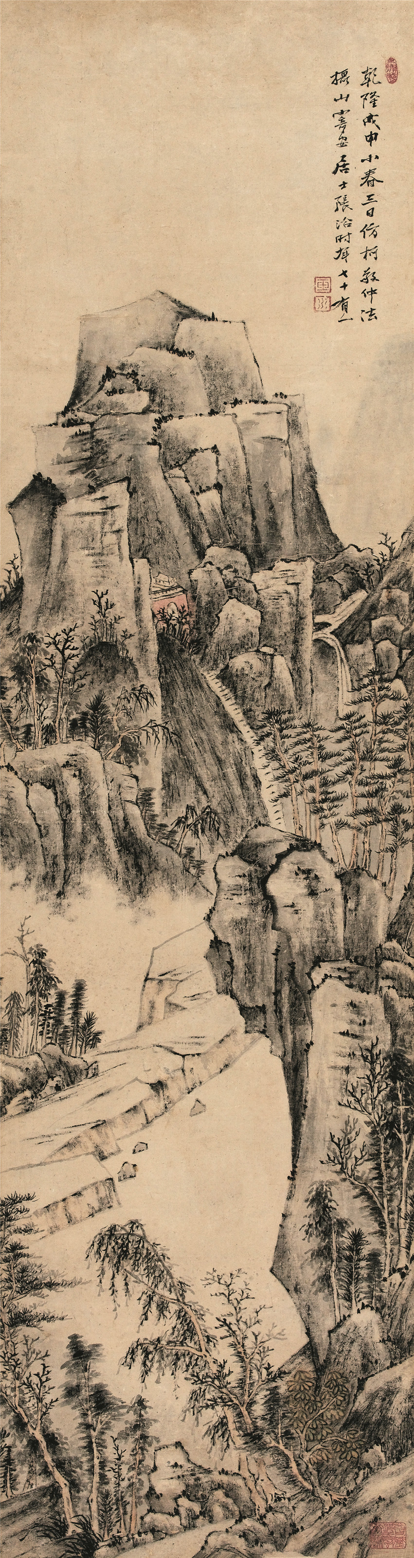 《仿元人山水》圖中山巒高大聳峙,山道屈曲,隱現於層巒之間,直達山寺,取境幽遠;雲霧氤氳浩渺,溪水奔湧,意境幽遠。林木蔥蘢鬱茂,鬆秀舒朗、參差有致,狀如閒雲野鶴,極具性靈,取柯九思畫樹法,寓柔媚於沉雄之中,於閒雅中見高致。山石方折剛硬,棱角突出,嶙峋堅實,皴染結合,堅凝挺峭,表現出山石之磅礴與山嶽崖壁之聳撥宏偉,意境高致。