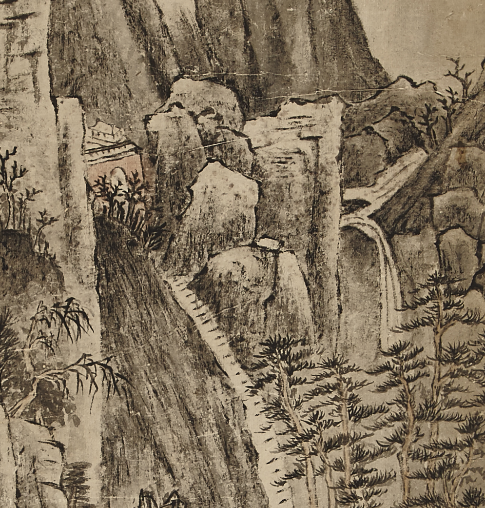 張洽繪畫細筆山水,峰迴水轉,每每遇到密不透風之處就添加石橋、山道、屋宇樓閣,解除了滿目細節帶來的壓迫感。此作山重水復,而山道穿插其中,不僅產生了疏密關係,也有了繁簡對比。整幅畫面結構宏大而細密,空間處理豐富而多變,其起伏頓挫之法、疏密聚散之意,均合古人法度而具己意,富秀潤清雅之美感,盡顯張洽駕馭筆墨的高超技法。此畫自然天成,可行可望,可遊可居,令觀者有流連忘返之感。