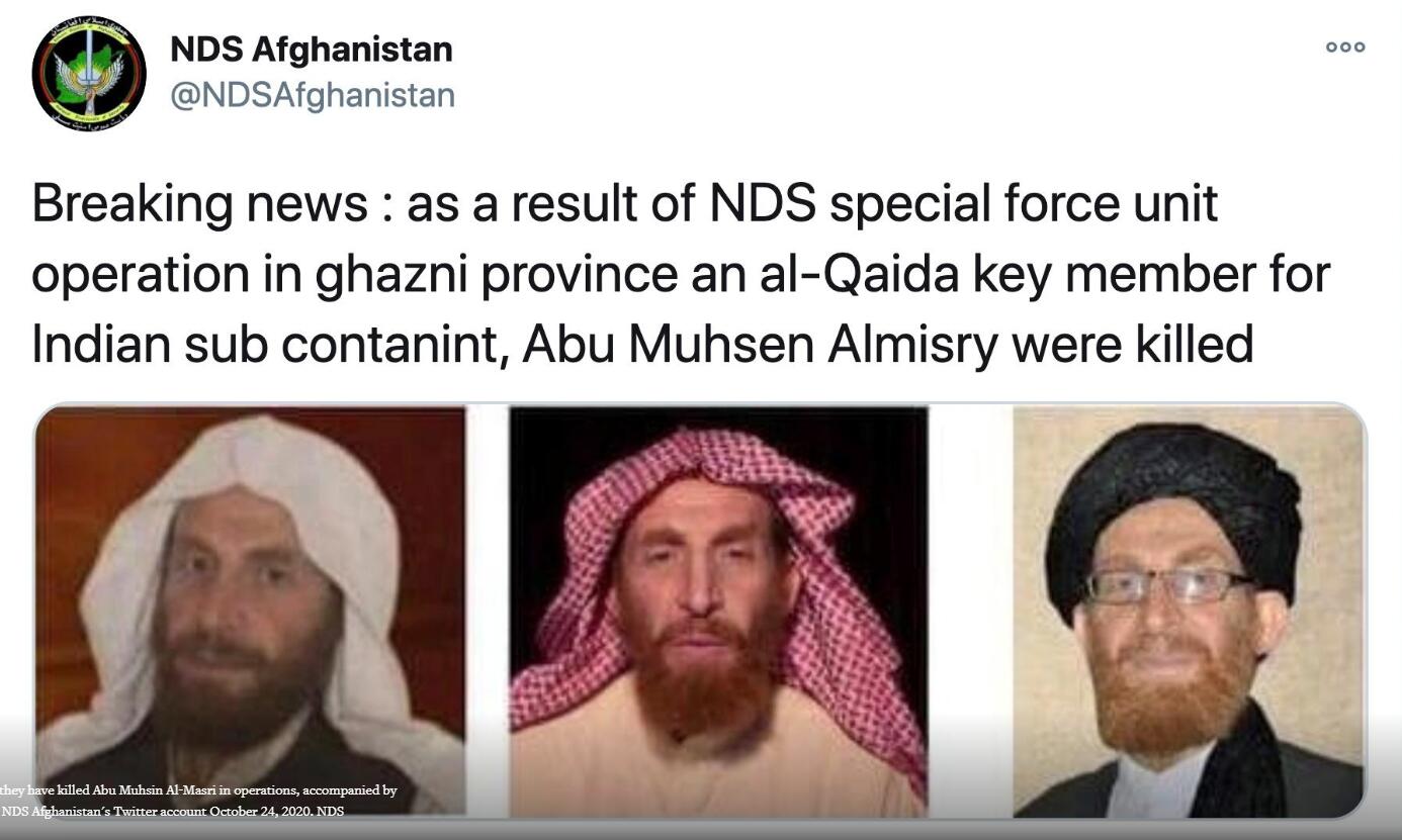 阿富汗國家安全局24日在推特發布消息稱,已擊斃阿蓋達組織2號領導人馬斯里。圖源:推特截圖