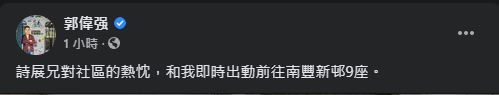 圖為郭偉強談及今日(25日)與東區區議員王詩展到鰂魚涌南豐新邨9座派發口罩的貼文內容。