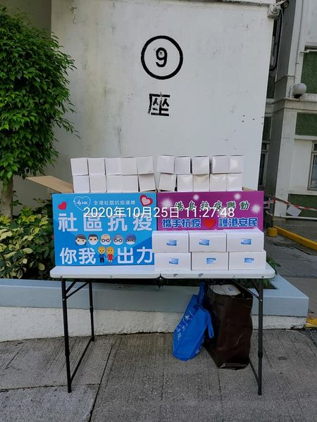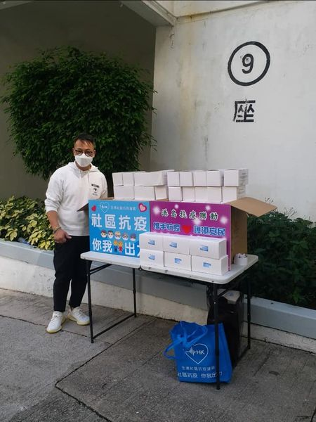 圖為工聯會立法會議員郭偉強、東區區議員王詩展及獲得口罩的南豐新邨9座居民合照。