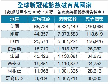 世衛數據顯示,全球新冠肺炎確診病例上周六數字較前一日增加465322例,再創疫情爆發以來單日最大增幅,而歐洲地區當日報告新增確診病例逾22.1萬宗,為世衛對全球劃分的6個地區中數量最多。歐洲疫情近期迅猛反彈是全球日增確診病例數字屢創新高的重要原因。截至昨晚9時,全球新增新冠確診病累計確診逾4311萬宗,累計逾115.6萬人不治。