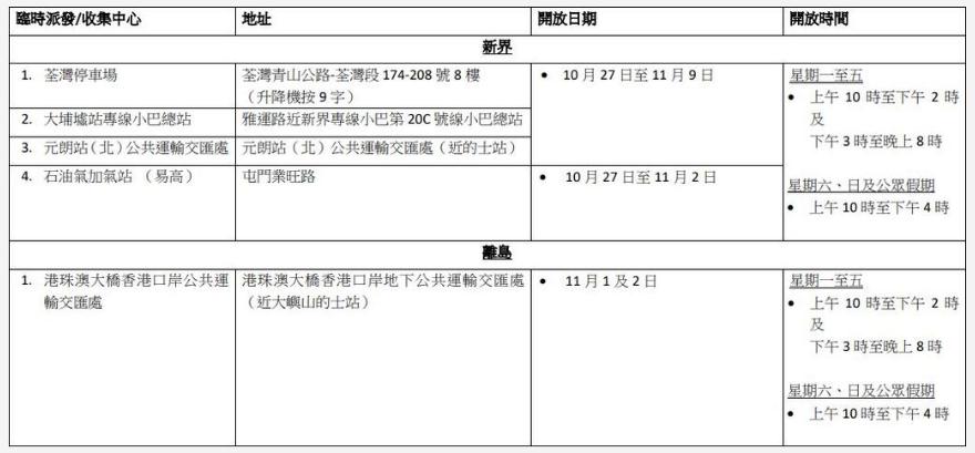發言人表示,病毒檢測是防疫抗疫策略中的重要一環,繼七月中及十月初提供的檢測服務,運輸署將於明日至11月9日繼續為的士及公共小巴司機安排新一輪免費檢測服務。14個臨時檢測套裝派發/樣本收集中心的地址、開放日期及時間如下: