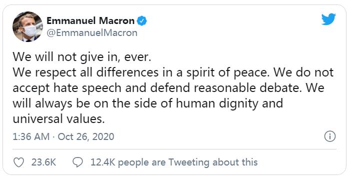 馬克龍周日在一條推文中表示,法國不會向宗教極端分子低頭,會全力捍衛理性辯論的權利,「我們將永遠站在人類尊嚴和普世價值觀的一邊」。