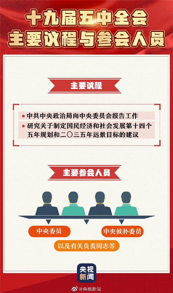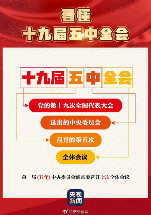 中國共產黨第十九屆中央委員會第五次全體會議,於10月26日至29日在北京舉行。主要議程是,中共中央政治局向中央委員會報告工作,研究關於制定國民經濟和社會發展第十四個五年規劃和二〇三五年遠景目標的建議。今天,一組圖帶你了解十九屆五中全會↓↓