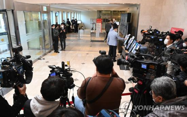 10月26日上午,在三星首爾醫院殯儀館前,各家媒體記者競相報道各界人士為已故三星集團會長李健熙弔唁的消息。(圖源:韓聯社)