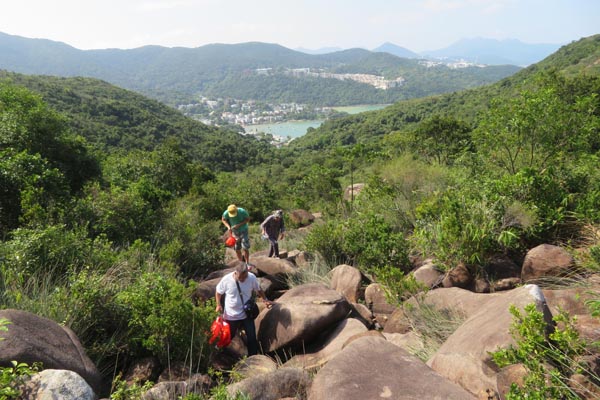 上洋村劉族村民到大山拜祭祖先,要走過崎嶇大石澗,遠方為相思灣一帶。記者 鄭玉君攝