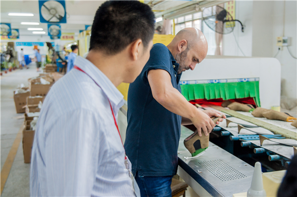 惠東鞋業越來越重視產品研發,圖為某企業聘請的國外研發工程師在研發新產品