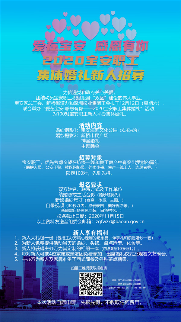 即日起,寶安區總工會、新橋街道辦和深圳報業集團工會將聯合舉辦「愛在寶安·感恩有你——2020寶安職工集體婚禮」活動,正式面向社會招募100對甜蜜新人。
