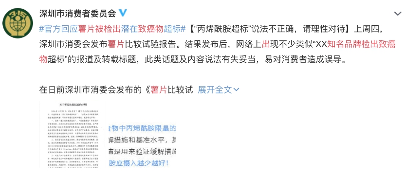 深圳市消費者委員會還在一份官方聲明中表示,使用「薯片丙烯酰胺超標」、「致癌物超標」等表述作為報道標題,對報告的原意存在重大誤解,會嚴重誤導消費者!
