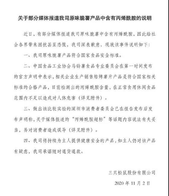 報告發布後,三隻松鼠一度回應稱:國家標準無丙烯酰胺限量要求,目前正常銷售。
