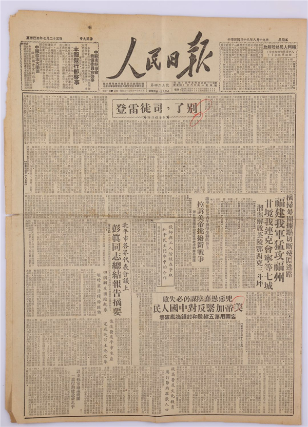 1949年8月19日人民日報頭版刊登「別了 司徒雷登」報紙原件