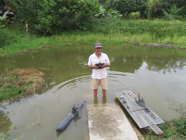 兩模型船來年或要多多出巡,明哥早前特地從貨櫃拿出來試水,黃銘謙、廖志協等人在旁觀看。不過因遙控電池有問題,在小魚塘的航母走得很慢,還有點傾斜。明哥解釋航母上闊下窄,保持平衡最難。潛艇則有死穴,它只能浮進及潛,不能在水底潛控,即不可令潛艇在水底向前向後推進,原來明哥買不到遙控,那是軍用的海底聲波雷達遙控,市場無得賣。