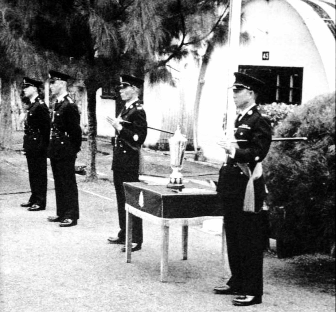 上世紀 60 年代,警察 機動部隊在鐵皮頂半圓 營房外進行頒獎。