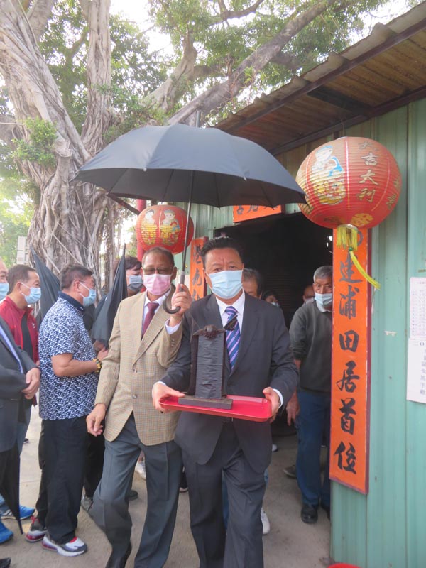 屏山鄉鄉委會主席鄧志強恭請天后神牌出臨時神棚。記者 鄭玉君攝