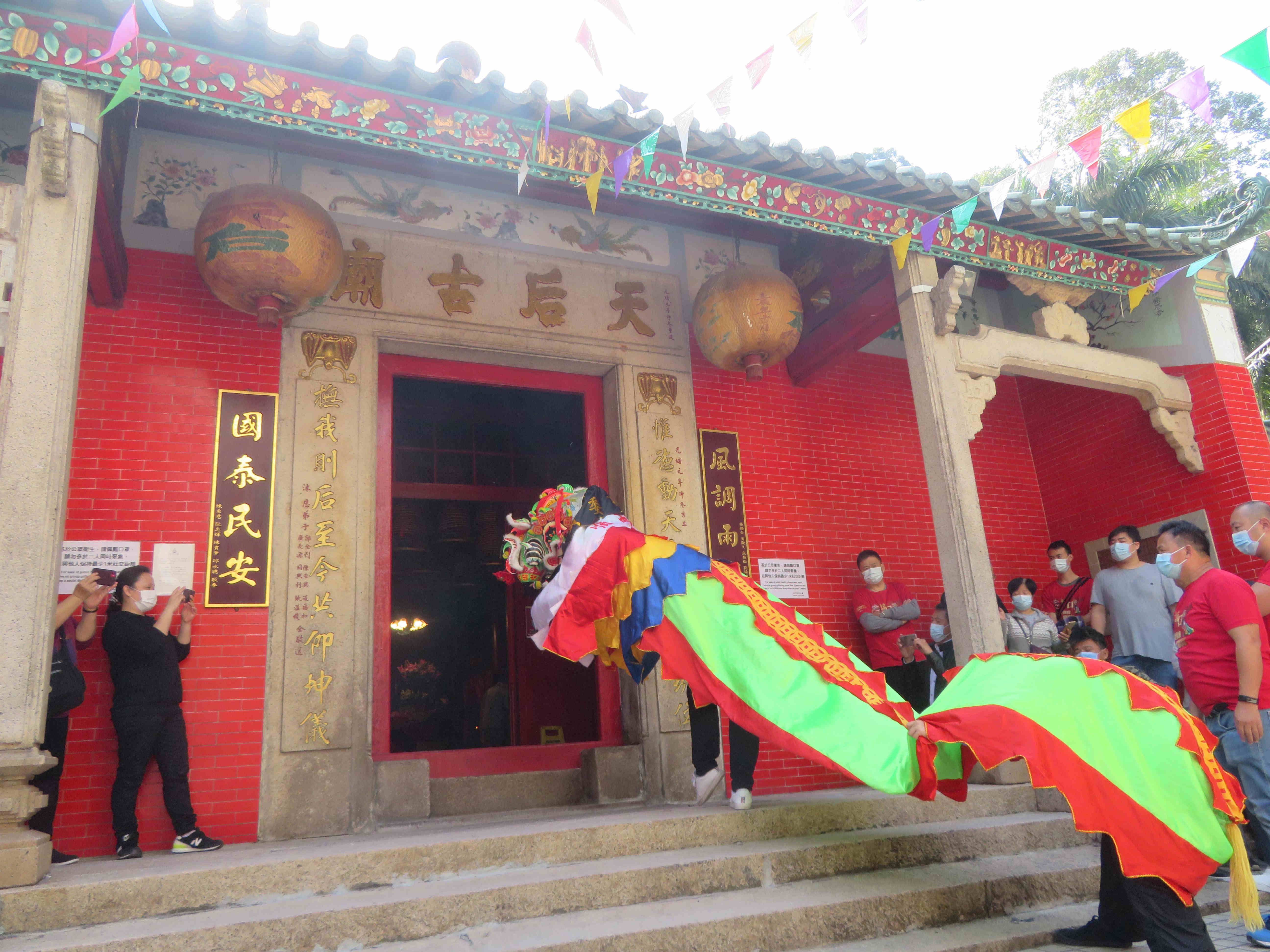 上午10時半,兩隻麒麟在鑼、鼓、鈸引奏下,先後進入坑口天后古廟參拜,其後採青。到11時,劉啟康率領鄉委會成員入廟上香拜神,向天后三鞠躬,祈求天后庇佑,在辛丑年風調雨順、國泰民安。活動進行期間,亦向參與者宣傳防疫信息,派發口罩及搓手液。