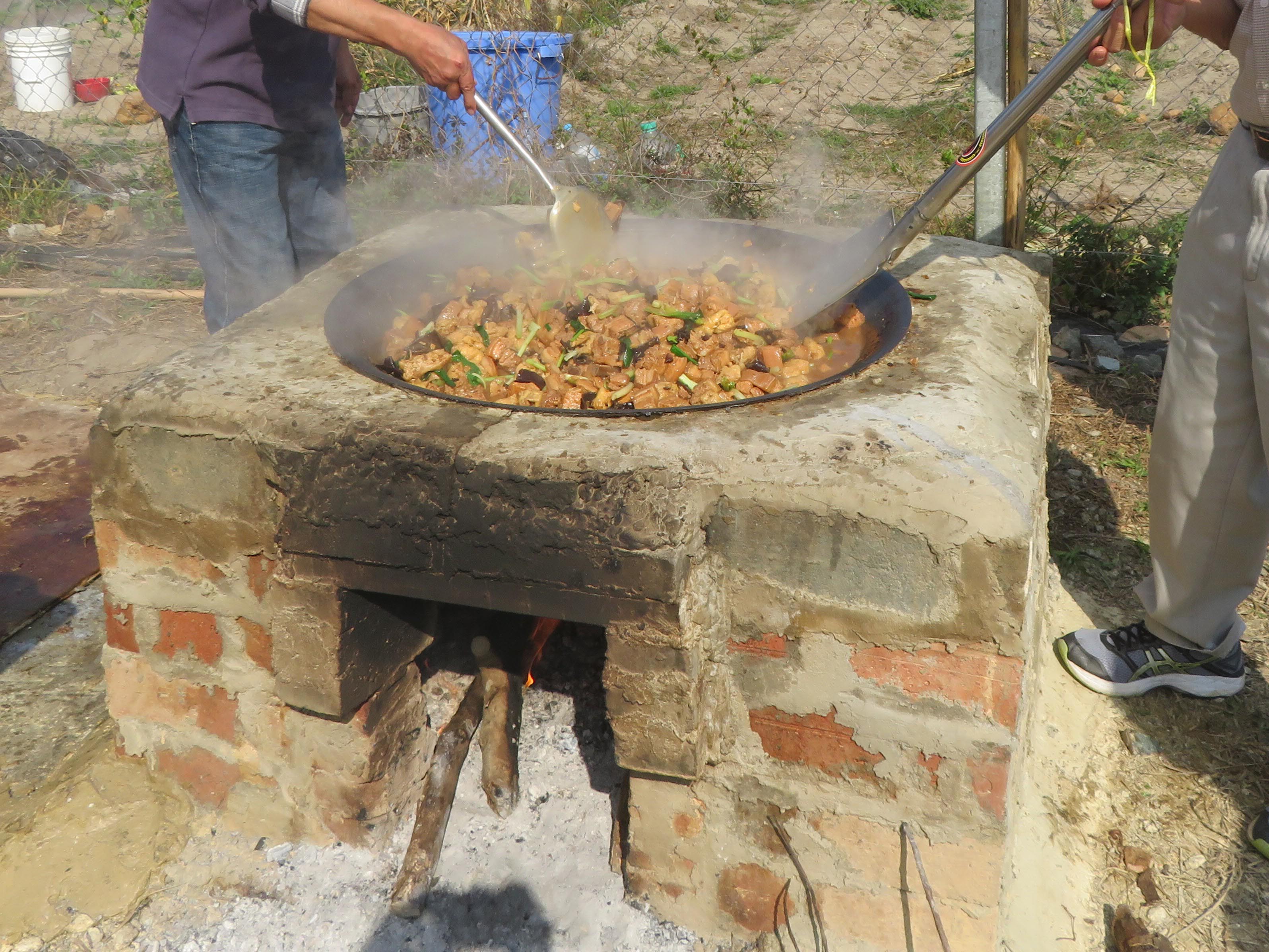 這條客家村幾近荒廢,近年一些村民致力復村,想找回「村落的味道」,試過炆豬肉兩次,但分量不多,只是十來斤。而辛丑年這一趟大陣仗得多,豬肉多達50斤。炆好的豬肉,除村民享用,亦拿到祠堂酬神。主廚是村民明哥,前兩次也有份參與,今次就成為掌舵人。有謂工欲善其事,必先利其器,有精於工程的村民特別造了一個可放大鑊的爐灶,打地台砌了三層磚,以黃泥隔熱,旁邊還有煙囪。此外,購置大鑊及鑊蓋,預先撿拾大堆枯木作燃料,其中有樟木。