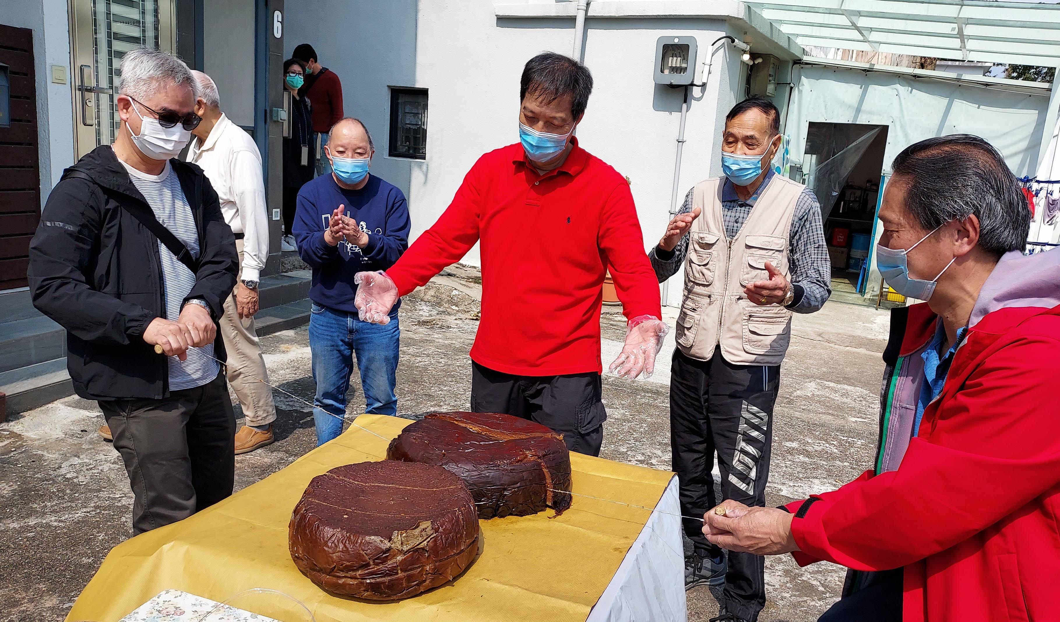 一些年長村民親身上陣,首度嘗試用手柄鋼線拉切茶粿,這種切茶粿方法是這10年間用的,村民從前開茶粿是用大菜刀壓墜落去切開。現場幫忙切粿及拿走茶粿的,無一不歡天喜地,記者亦即場吃了幾口甜茶粿,味道香甜,不枉劉通宵做粿,花了近30小時蒸製,而且石油氣蒸爐需要每4小時加水一次,晚上只睡了幾小時。