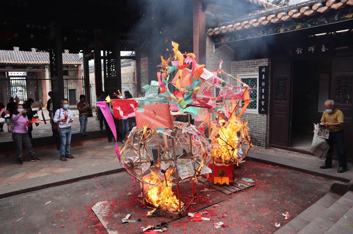 正月十五元宵日,圓燈儀式較簡單。新丁家人拜神後,將燈盞放入紅桶內,更為傳統的,會放入鋪有紅紙的米斗內,然後拿回家供奉。到11時45分,舉行化燈儀式,工作人員將花燈陸續取下放在中間天井位置,這時每個新丁家人都熱烈地將燈上的紙片撕下,這些紙片不少附有吉祥圖案如麻姑進酒、丁財貴壽、五福臨門、添丁發財、加官晉爵等。當大家拿得七七八八,工作人員即將花燈化掉,之後亦是燃放爆竹及分燒豬肉,整個點燈儀式至此圓滿結束。