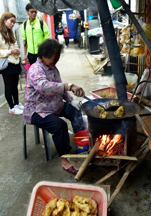有漁民婦女在門前路邊起爐架鑊,把赤魚膠爆炒成魚肚出售吸引了遊人圍觀購買。爆魚肚是漁民傳統做法,目的是要其膨脹鬆脆,浸水發大後可煮成豬皮口感般的軟滑魚肚。過去曾以油炸久放易有變壞的油膉味,故現以鹽爆加工,只要火勢控制得宜,每一兩分鐘翻炒一次約20分鐘便可完成。蜑家人和客家人都十分喜愛吃由門鱔魚鰾爆成的鱔肚,因為其可吸收別的食材汁液增加美味,加上入口軟滑故老幼咸宜。過去有大澳漁民愛在大風浪中以延繩排專釣門鱔。