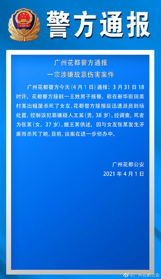 據廣州花都公安4月1日通報,3月31日18時許,花都警方接到一王姓男子報警,稱在新華街田美村某出租屋殺死了女友。花都警方接報後迅速派員到場處置,控制該犯罪嫌疑人王某(男,38歲)。經調查,死者為張某(女,37歲)。據王某供述,因與女友張某發生矛盾而殺死了她。目前,該案在進一步偵辦中。
