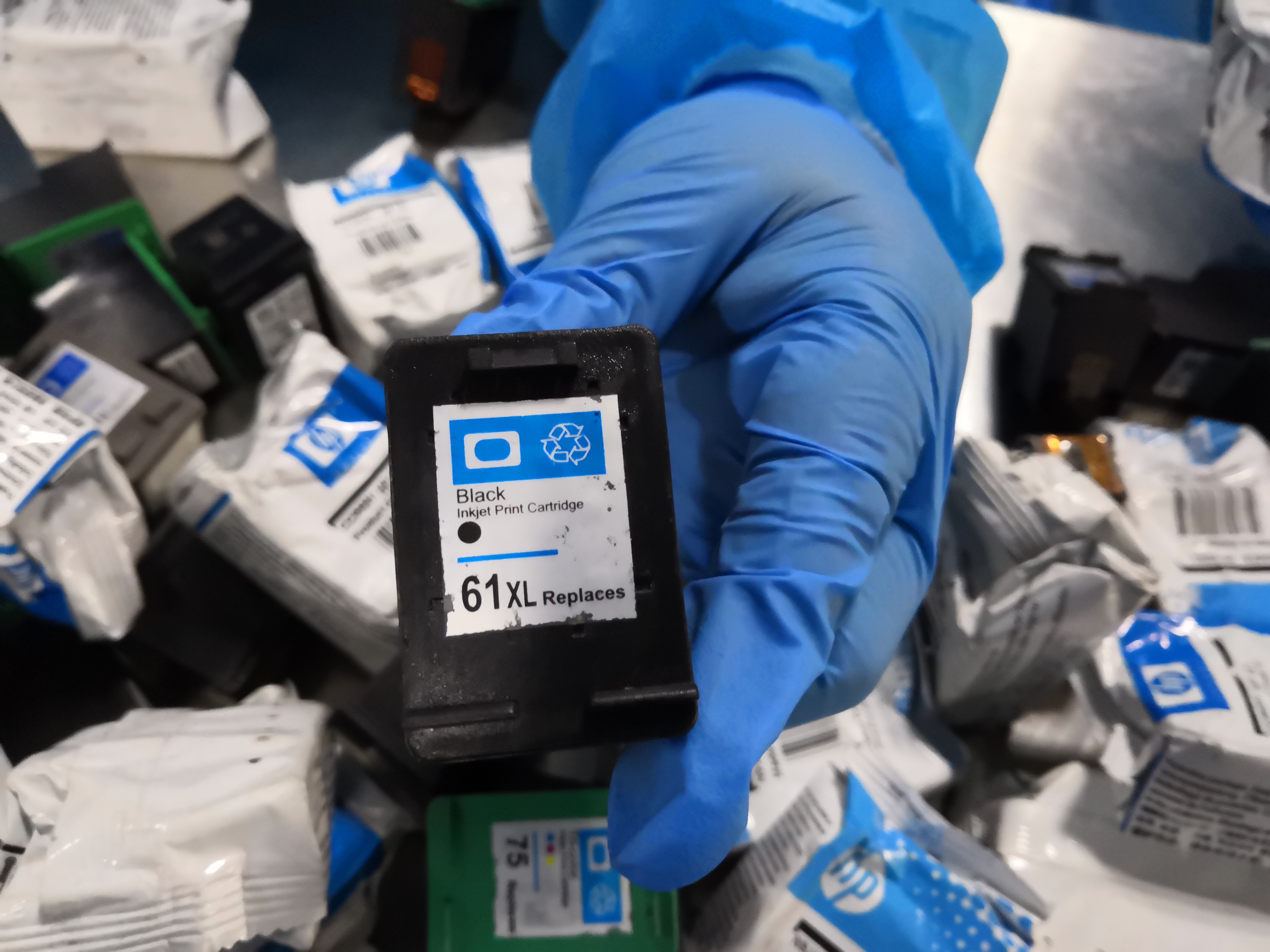 近日,廣州海關所屬廣州白雲機場海關關員在對一票自東南亞進口、申報品名為  的貨物進行查驗時,發現貨物外包裝紙箱殘舊,內部堆放雜亂,墨盒外包裝印有「HP」標誌,部分無獨立包裝。這批墨盒的表面標籤破損、有明顯劃痕,且有黑色油墨滲出,現場判斷疑似禁止進境固體廢物。經取樣送鑑定,確認屬於國家禁止進口的固體廢物,數量共581個、重約35千克。
